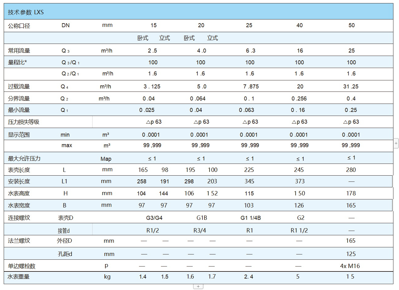 精確度高、計量準確 、維修方便 、技術指標達GB/T778 . 1~3-2018標準。液封係列計數器與被測水隔開能長期保持示值清晰。與水接觸零部件采用優質防腐防汙材料製作。DN15 ~40采用標準管螺紋 ,DN50以上采用法蘭連接 (鐵殼) 。